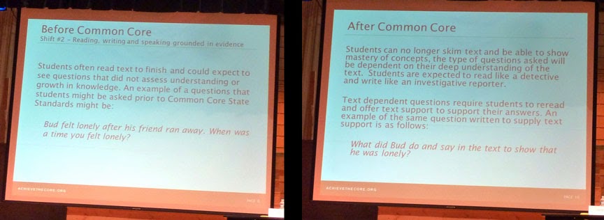 I have to admit, Sandra Alberti, of Student Achievement Partners (founded by the lead writers of the Common Core State Standards) did a great job as keynote speaker. Much of what she was saying made good sense. For example, she talked about how it used to be possible to get by in Language Arts without having to read any of the assigned material because the questions asked afterward made it unnecessary, but under Common Core the questions relate to the material (click the image to see it larger):